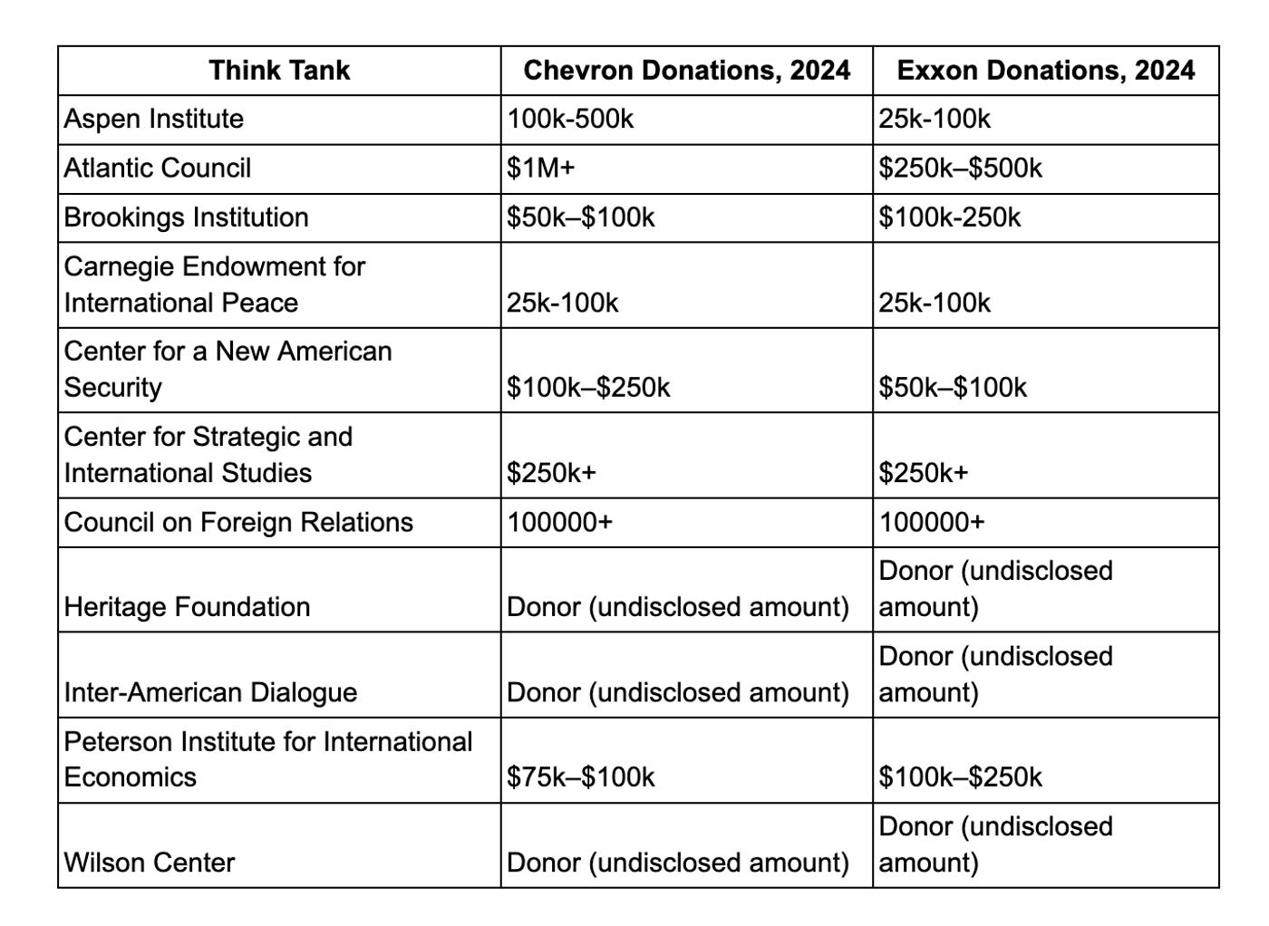 However, many critics of the Chevron model are themselves embraced by the oil lobby. Exxon has become a symbol of the maximum pressure campaign and an “enemy of the Venezuelan people” according to Maduro, for working with neighboring Guyana in territory disputed by Venezuela. Exxon donates at least $900,000 per year to DC’s top 20 think tanks, according to an RS analysis.